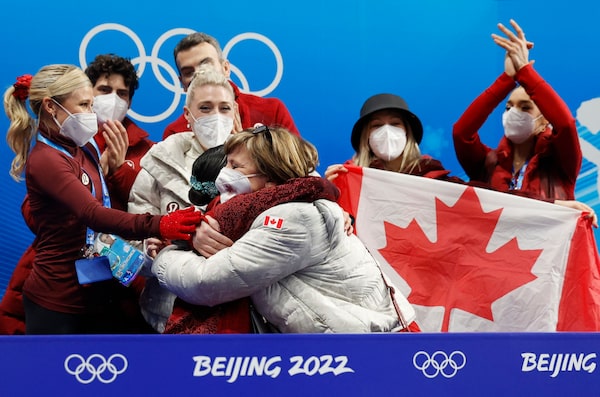 Canada's Madeline Schizas of Canada reacts with her team after finishing fourth in the team figure skating event at the Bejing Winter Olympics.PHIL NOBLE/Reuters