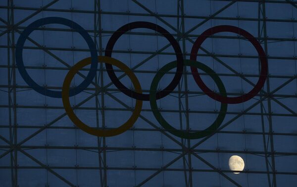The moon is seen next to Olympic rings at St James' Park soccer stadium during the men's Group D football match between Spain and Honduras at the London 2012 Olympic Games in Newcastle July 29, 2012.Nigel Roddis/Reuters