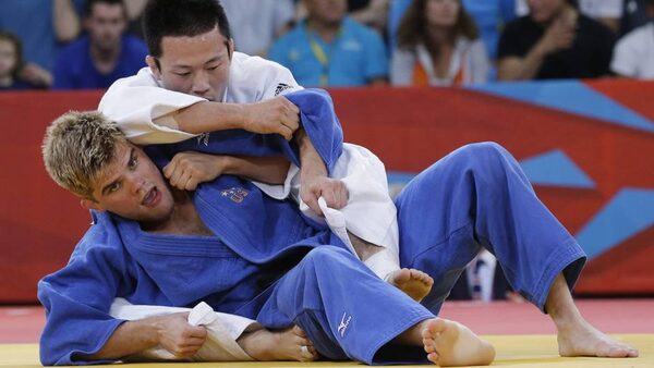 Wang Ki-chun of South Korea, top, competes with Nicholas Delpopolo of the United States during the men's 73-kg judo competition at the 2012 Summer Olympics, Monday, July 30, 2012, in London.The Associated Press