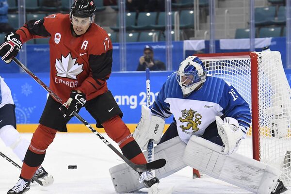 Canadian forward Rene Bourque tries to deflect the puck pass Finland goaltender Mikko Koskinen during the second period at the 2018 Olympic Winter Games in Pyeongchang, South Korea, on Feb. 21, 2018.Nathan Denette
