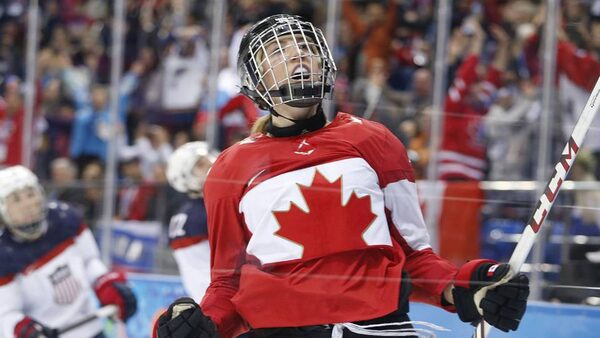 Meghan Agosta-Marciano of Canada celebrates her second goal against the United States during the 2014 Winter Olympics women's ice hockey game at Shayba Arena, Wednesday, Feb. 12, 2014, in Sochi, Russia.The Associated Press