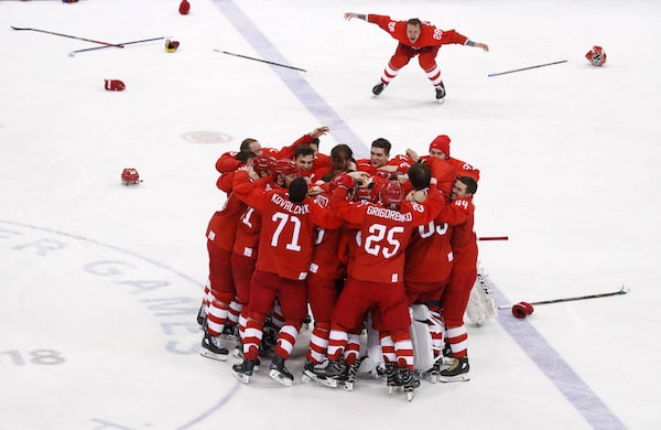 The medal is Russia's second gold of the Olympics and there were questions as to how the hockey players would react if they won, since the game was one of the last events being played. A few days earlier, when Russia dominated the women's figure skating, taking both gold and silver, the country's athletes were on their best behaviour, perhaps not wanting to cause any friction with the IOC on the chance the ban might be lifted for the closing ceremonies.