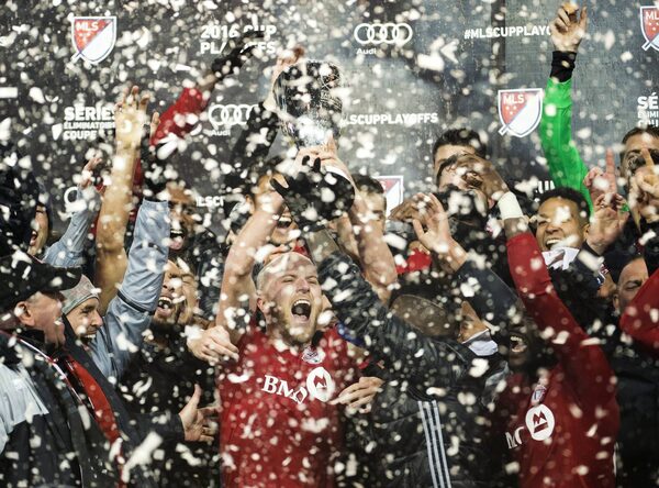 Toronto FC midfielder Michael Bradley (4) reacts with the trophy after defeating the Montreal Impact during overtime MLS eastern conference playoff soccer final action in Toronto on November 30.Nathan Denette/The Canadian Press