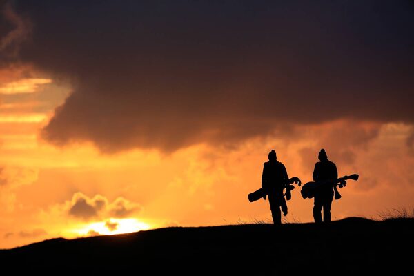 YEAR IN FOCUS - SPORTS (1 of a set of 105) RYE, ENGLAND - JANUARY 08: Fergus Hardy of Lincoln College Oxford and Callum Slowther of Worcster College Oxford leave the tee as the sun rises on the first hole against the sunrise during the Oxford and Cambridge Golfing Society President's Putter at Rye Golf Club on January 8, 2016 in Rye, England. (Photo by David Cannon/Getty Images)David Cannon/Getty Images