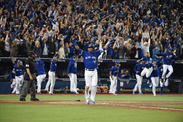 Toronto Blue Jay Edwin Encarnacion raises his arms in the air after driving in the winning run as the Jays defeated the Baltimore Orioles in an American League wild card game at the Rogers centre on Oct 4.Fred Lum/The Globe and Mail