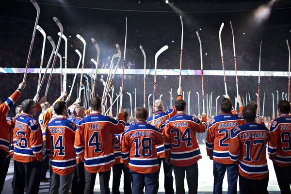 Edmonton Oilers alumni salute the crowd during a farewell ceremony at Rexall Place in Edmonton, Alta., on April 6.JASON FRANSON/The Canadian Press