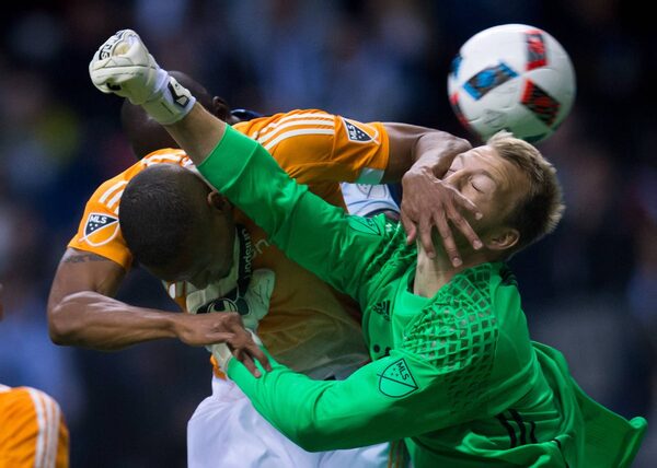 Houston Dynamo's Ricardo Clark, left, gets his hand in the face of teammate, goalkeeper Joe Willis, right, as he tries to punch the ball away from Vancouver Whitecaps' Kekuta Manneh, back, during the first half of an MLS soccer game in Vancouver, B.C., on March 26.Darryl Dyck/The Canadian Press