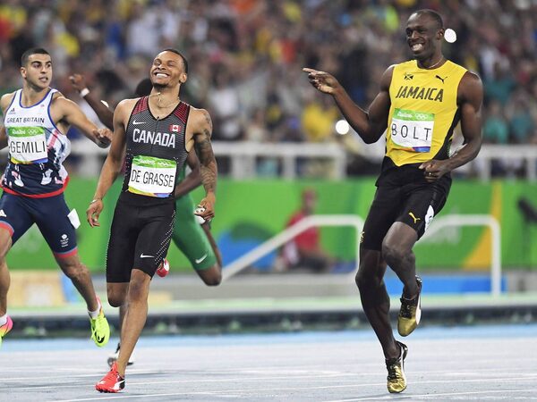 Canada's Andre De Grasse, centre, and Jamaica's Usain Bolt share a laugh as they compete during the men's 200-metre semifinals at the 2016 Summer Olympics in Rio de Janeiro, Brazil on August 17.Frank Gunn/The Canadian Press