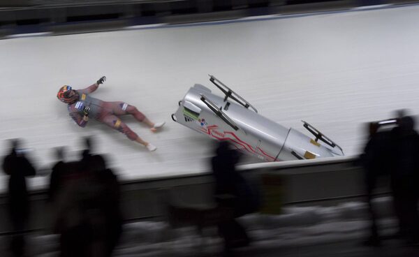 Brakeman Keunbo Kim of Korea falls out of his sled as he and pilot Donghyun Kim race during the second run of 2-man bobsled at the IBSF World Cup in Whistler, B.C. on Jan. 23.Jonathan Hayward/The Canadian Press