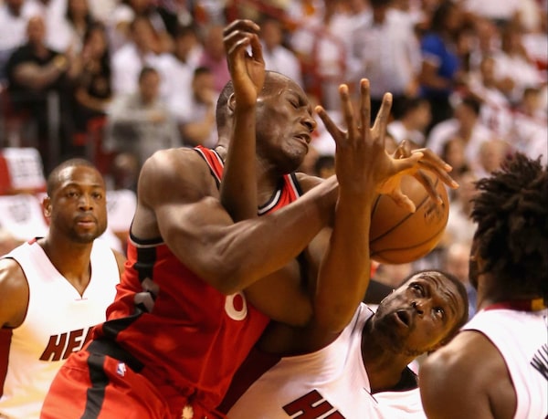 Bismack Biyombo #8 of the Toronto Raptors and Luol Deng #9 of the Miami Heat battle for a loose ball .Streeter Lecka/Getty Images