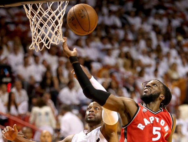 DeMarre Carroll #5 of the Toronto Raptors and Dwyane Wade #3 of the Miami Heat go after a loose ball.Streeter Lecka/Getty Images
