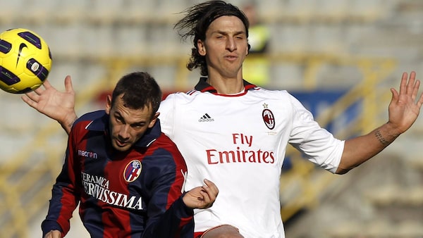AC Milan's Zlatan Ibrahimovic (R) challenges Francesco Della Rocca of Bologna during their Serie A soccer match at the RenatoDall'Ara stadium in Bologna December 12, 2010. REUTERS/Alessandro BianchiALESSANDRO BIANCHI/Reuters