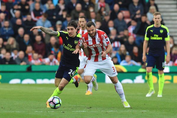 Arsenal’s Hector Bellerin vies with Stoke City’s Erik Pieters during the English Premier League football match between Stoke City and Arsenal at the Bet365 Stadium in Stoke-on-Trent, England, on May 13, 2017.LINDSEY PARNABY/AFP / Getty Images