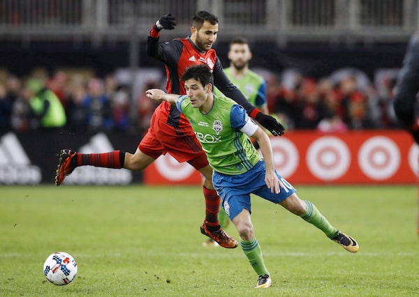 Toronto FC defender Steven Beitashour defends as Seattle Sounders midfielder Nicolas Lodeiro moves the ball in Toronto on Dec. 9, 2017.Mark Blinch/The Canadian Press