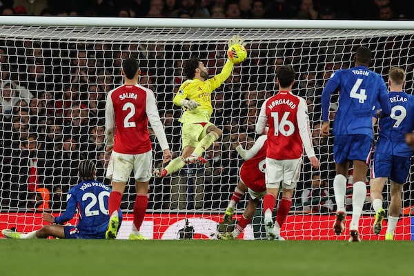 Arsenal's Spanish goalkeeper David Raya (centre) makes a save in extra time during his team's English Premier League match against Chelsea at the Emirates Stadium in London on Sunday.ADRIAN DENNIS/AFP/Getty Images