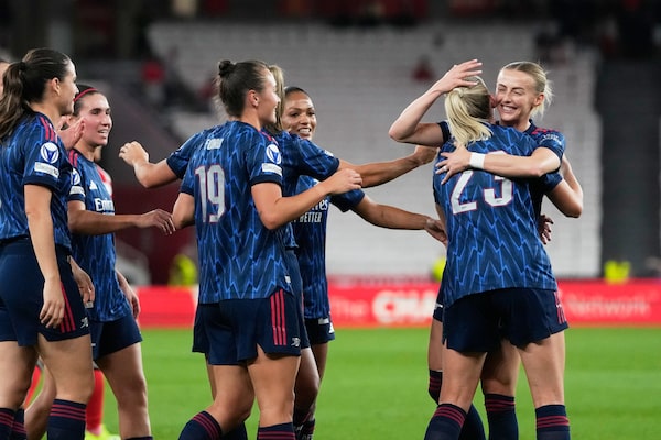 Arsenal's Alessia Russo, second right, celebrates with teammates after scoring her side's second goal during the women's Champions League opening phase match between SL Benfica and Arsenal at the Luz Stadium, in Lisbon, Portugal on Thursday.Armando Franca/The Associated Press