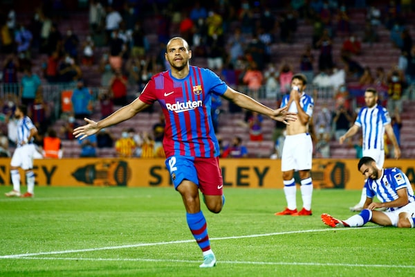 Barcelona's Martin Braithwaite celebrates after scoring his side's third goal against Real Sociedad at Camp Nou stadium in Barcelona, Spain, on Aug. 15, 2021.Joan Monfort/The Associated Press