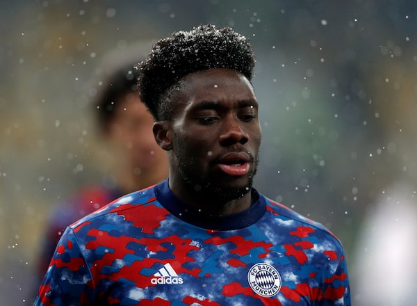 Bayern Munich's Alphonso Davies warms up before a Champions League group match against Dynamo Kyiv, at NSC Olympiyskiy, in Kyiv, Ukraine, on Nov. 23, 2021.VALENTYN OGIRENKO/Reuters