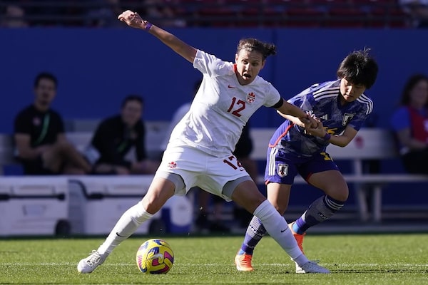 Canada forward Christine Sinclair battles for the ball with Japan forward Mana Iwabuchi during a SheBelieves Cup match in Frisco, Tex., on Feb. 22.The Associated Press
