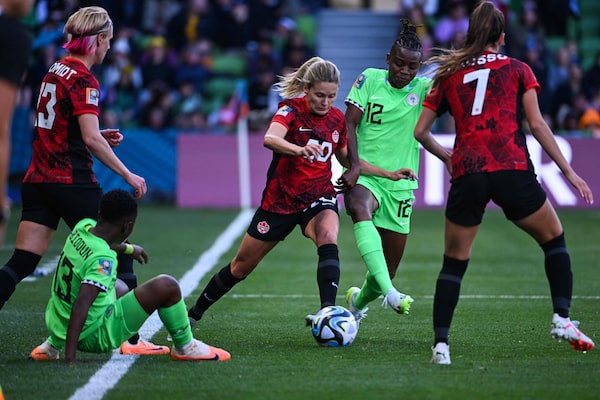 Canada forward Cloe Lacasse and Nigeria forward Uchenna Kanu battle for the ball during a Women's World Cup match as AAMI Park, in Melbourne, Australia, on July 21.WILLIAM WEST/AFP/Getty Images