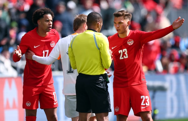 Canada's Tajon Buchanan and Niko Sigur appeal to the referee after Buchanan was shown a red card on Saturday.Vaughn Ridley/Getty Images