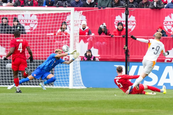 Iceland's Orri Steinn Oskarsson shoots past Canada goalkeeper Dayne St. Clair to score his country's second goal during first half International friendly soccer action in Toronto on Saturday March 28, 2026.THE CANADIAN PRESS/Chris YoungChris Young/The Canadian Press