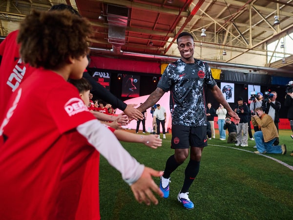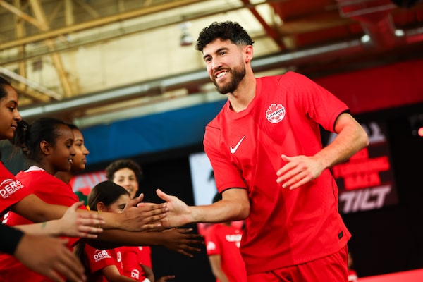 Richie Laryea wears the new Team Canada 2026 World Cup jersey as he greets young fans.Sammy Kogan/The Canadian Press