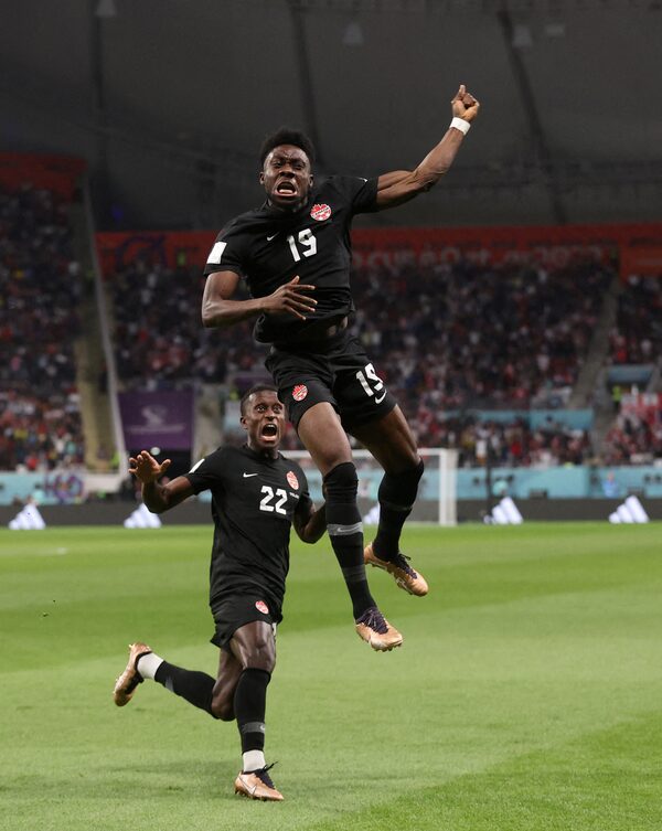 Canada's Alphonso Davies celebrates scoring their first goal of the World Cup during the Canada vs. Croatia game at Khalifa International Stadium on Nov. 27.CARL RECINE/Reuters