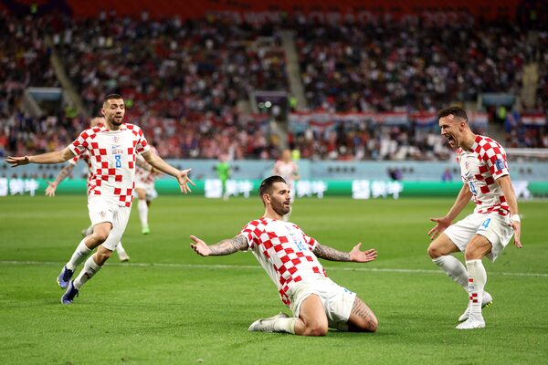Marko Livaja of Croatia celebrates with teammates Mateo Kovacic and Ivan Perisic after scoring their team's second goal during the FIFA World Cup Qatar 2022 Group F match between Croatia and Canada at Khalifa International Stadium on November 27, 2022 in Doha, Qatar.Dean Mouhtaropoulos/Getty Images