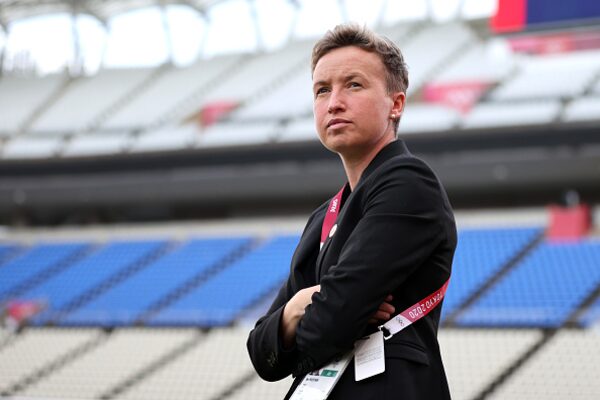 Ms. Priestman, while in her former role as assistant coach of England, conducts the warm up prior to the 2019 FIFA Women's World Cup match between Japan and England on June 19, 2019, in Nice, France.Laurence Griffiths/Getty Images