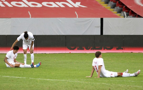 Canada's players (from L) David Norman, Thomas Meilleur-Giguere and Zorhan Bassong react after losing their CONCACAF Olympic qualification semifinal match against Mexico at the Jalisco Stadium in Guadalajara, Mexico, on March 28, 2021.ULISES RUIZ/AFP/Getty Images