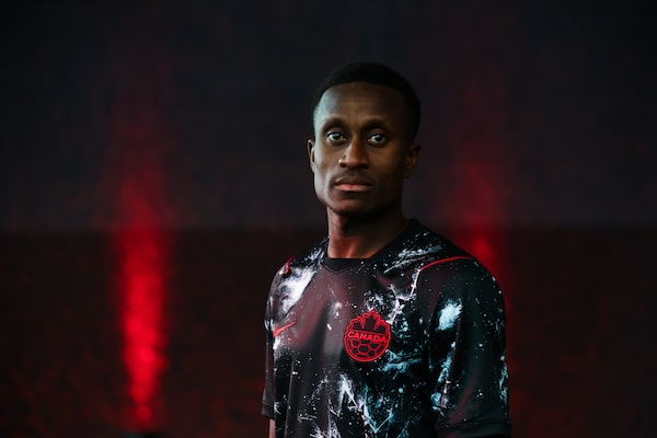 Richie Laryea sports the Canadian team's World Cup jersey during its unveiling. It features a 'lucky loonie' on the inside of the neck.Cole Burston/The Globe and Mail