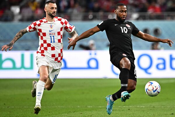 Croatia's midfielder #11 Marcelo Brozovic (L) fights for the ball with Canada's forward #10 Junior Hoilett (R) during the Qatar 2022 World Cup Group F football match between Croatia and Canada at the Khalifa International Stadium in Doha on November 27, 2022.ANNE-CHRISTINE POUJOULAT/AFP/Getty Images