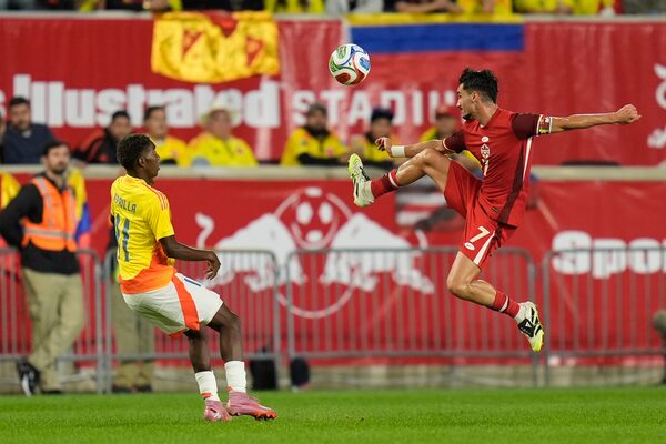 Canada's Stephen Eustáquio, right, kicks the ball during the second half of a friendly soccer match against Colombia in Harrison, N.J., on Tuesday.Seth Wenig/The Associated Press
