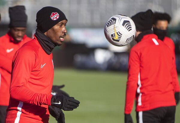 Canada's Atiba Hutchinson takes part in a practice session in Edmonton, on Nov. 10, 2021.JASON FRANSON/The Canadian Press
