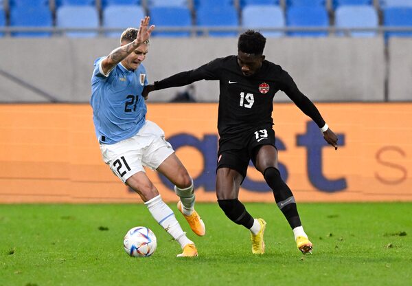 Canada's Alphonso Davies battles for the ball with Uruguay's Guillermo Varela during an international friendly in Bratislava, Slovakia, on Sept. 22.RADOVAN STOKLASA/Reuters