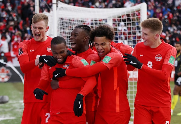 Canada players celebrate after scoring a goal against Jamaica during a 2022 World Cup qualifying match at BMO Field, in Toronto, On March 27.CARLOS OSORIO/Reuters