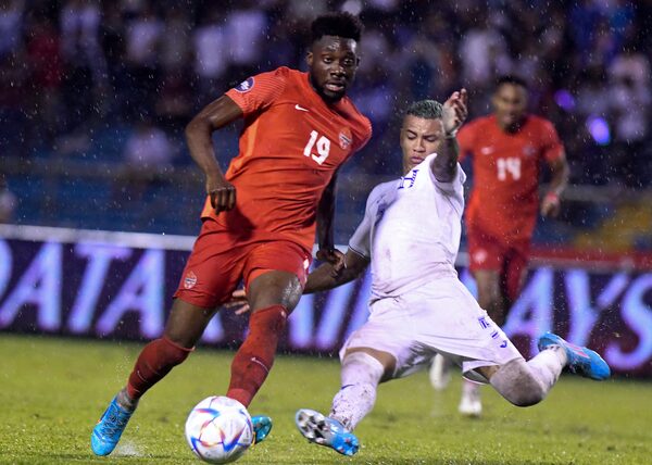 Honduras' Kervin Arriaga vies for the ball with Canada's Alphonso Davis during a CONCACAF Nations League match at the Olympic Stadium, in San Pedro Sula, Honduras, on June 13.ORLANDO SIERRA/AFP/Getty Images