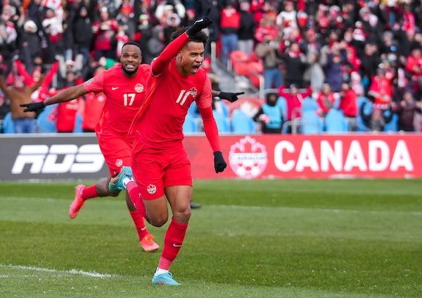 Canada’s Tajon Buchanan celebrates after scoring a goal during a World Cup qualifying match against Jamaica, in Toronto, on March 27, 2022.Nathan Denette/The Canadian Press
