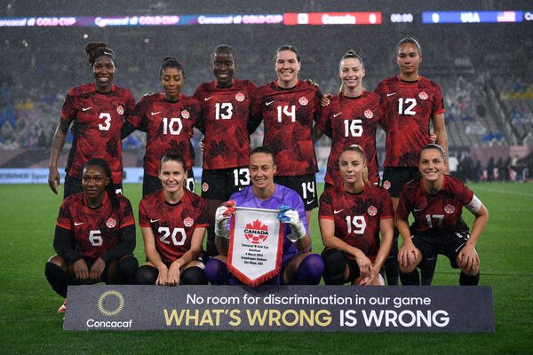 Canada's starting XI pose for a photograph before the 2024 CONCACAF W Gold Cup semi-final match against the U.S., in San Diego, Calif., on March 6.Orlando Ramirez/Reuters