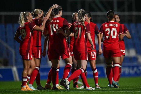 Canada players celebrate after scoring a goal during a friendly against South Korea, in Murcia, Spain, on Dec. 3.Francisco Macia Martinez/The Associated Press