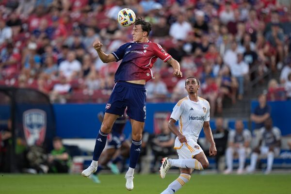 FC Dallas forward Petar Musa jumps for a header in front of Los Angeles Galaxy defender Jalen Neal, right, during the first half of an MLS soccer match Saturday, July 13, 2024, in Frisco, Texas. CF Montréal has acquired Neal from the Los Angeles Galaxy, the Major League Soccer club announced on Jan. 6, 2025.LM Otero/The Associated Press