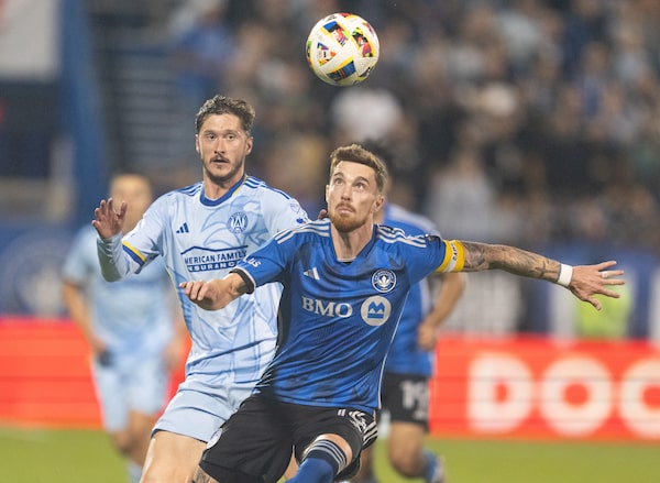 CF Montreal defender Joel Waterman (right) and Atlanta United midfielder Alexey Miranchuk battle for the ball in Montreal on Oct. 22, 2024.Christinne Muschi/The Canadian Press