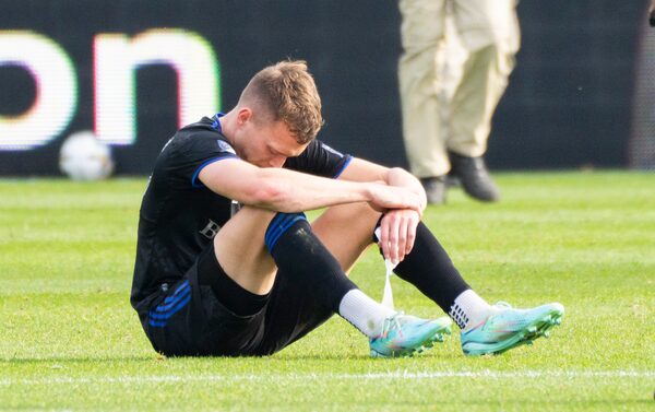 CF Montreal defender Alistair Johnston sits on the pitch after losing to the New York City FC during the Eastern Conference semifinals MLS action in Montreal on Oct. 23, 2022.Paul Chiasson/The Canadian Press