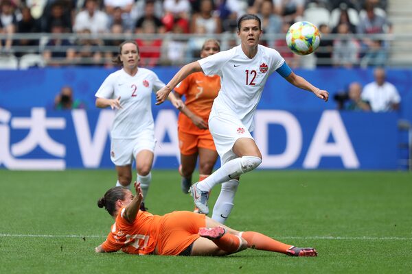 Christine Sinclair is challenged by Sherida Spitse of the Netherlands during the 2019 FIFA Women's World Cup France group E match between Netherlands and Canada at Stade Auguste Delaune on June 20, 2019 in Reims, France.Robert Cianflone/Getty Images