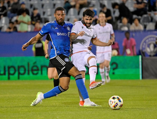 Forge FC Hamilton forward Tristan Borges plays the ball and CF Montreal defender George Campbell defends during the second half at Stade Saputo. Forge FC won 2-1 on May 22, 2024.Eric Bolte/Reuters