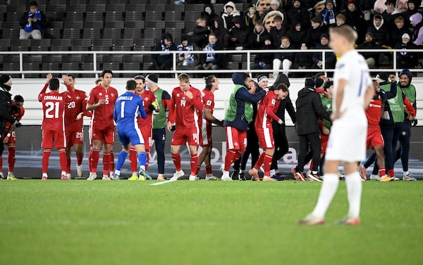 Malta players celebrate a goal by Jake Grech during their FIFA World Cup 2026 Group G qualifying match against Finland in Helsinki on Friday.Heikki Saukkomaa/The Associated Press
