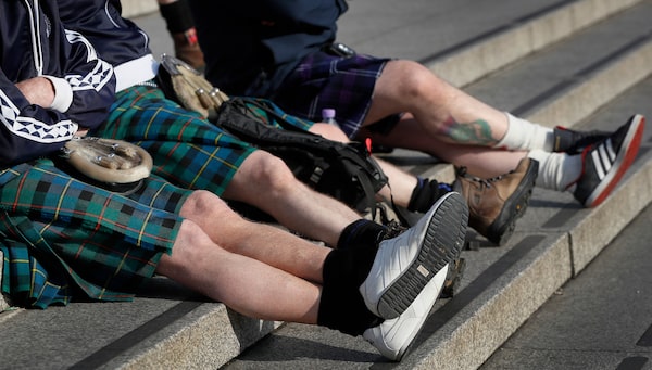Scottish soccer fans wearing kilts sit on the steps in Trafalgar Square after attending a service to mark Armistice Day in London, Friday, Nov. 11, 2016.Kirsty Wigglesworth/The Associated Press