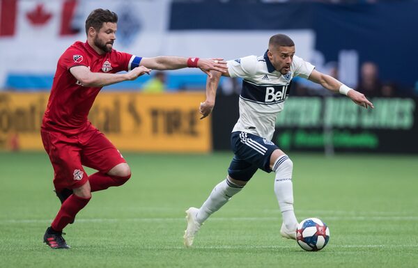Vancouver Whitecaps' Lucas Venuto, right, runs with the ball as Toronto FC's Drew Moor defends during an MLS game in Vancouver on May 31, 2019.Darryl Dyck/The Canadian Press