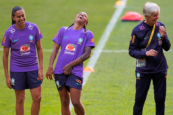 Brazilian soccer players Geyse Ferreira, left, Andressa Alves and coach Pia Sundhage laugh before the start of a training session at the Mane Garrincha stadium, in Brasilia, Brazil, on July 1.Eraldo Peres/The Associated Press